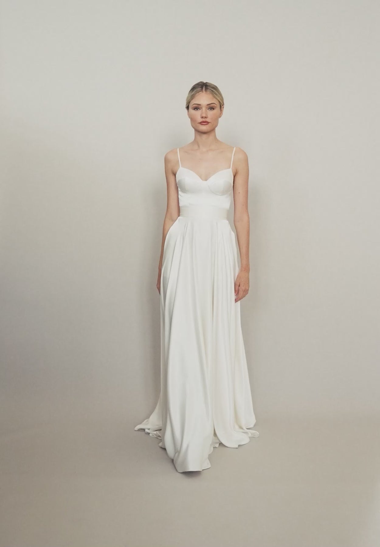 The Alea Bodice is a classic bustier-style bodice cut from luxurious bridal ivory heavy satin. Featuring built-in bust cups and boned seams, this bodice offers brides multiple styling options. Skinny silk satin straps and a rounded back ensure a snug fit. The back opens with a delicate row of satin-covered buttons.