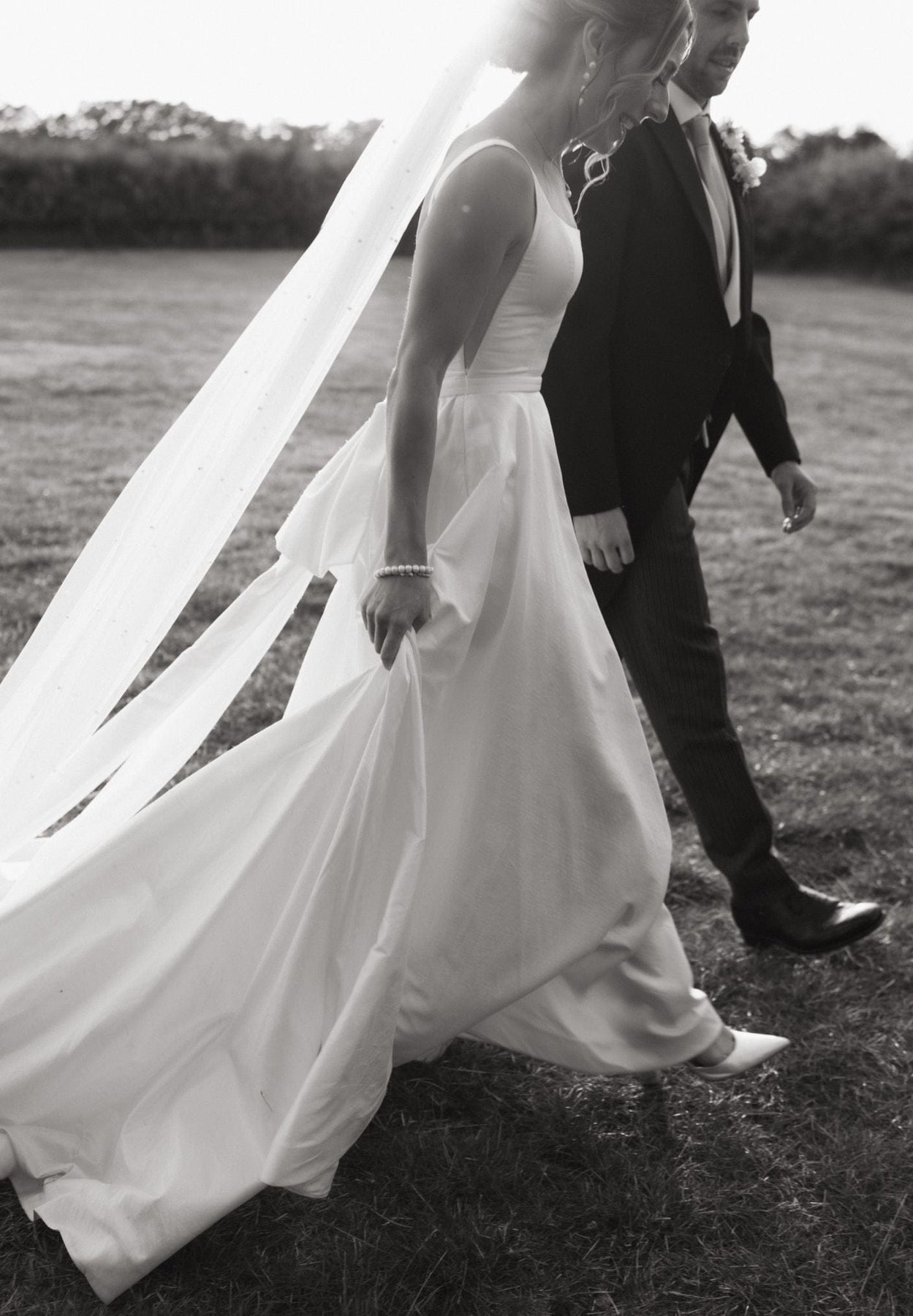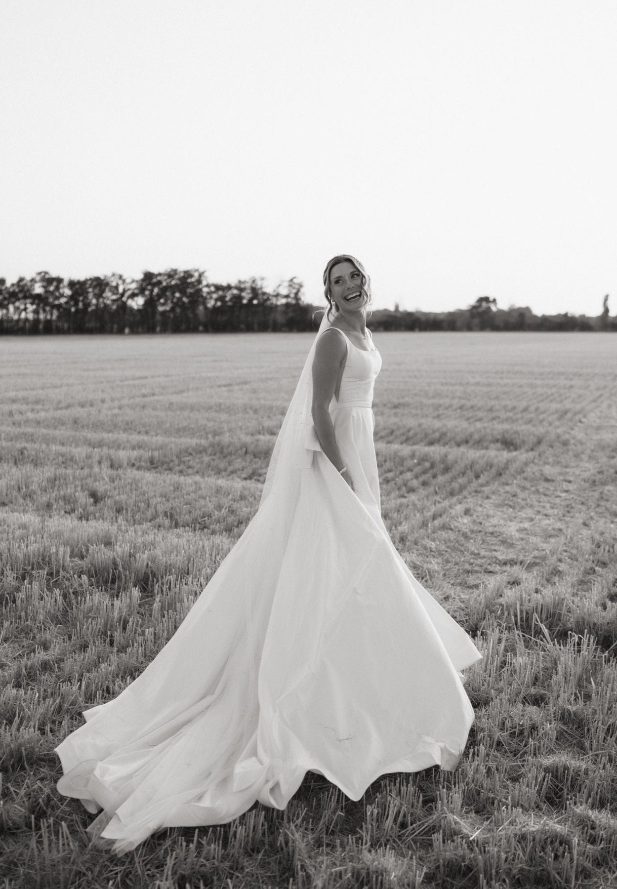 The Angus Gown perfectly marries modern elegance with a classic bridal silhouette. Cut from oyster coloured 100% Dupion silk, this tailored gown features a scooped front and back neckline connected with illusion tulle side bodice insets. The dramatic A-line skirt drapes down to a sweeping train with elevating details such as horse hair canvasing to add volume and movement to the hemline. For the finishing touch, a detachable bow belt allows you to style this gown in various ways to truly make it your own.