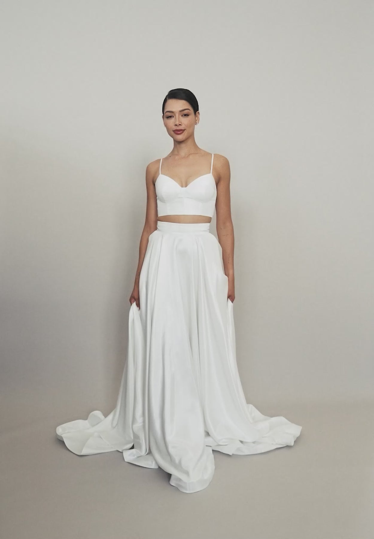 The oyster toned Anna Bodice is cut from Thai satin, a beautifully textured, crisp fabrication that allows for the structural lines and snug fit of this modern top. Housing bust cups and boning, the skinny silk straps further secure the fit. The cropped fit adds a hint of modernity that makes this top perfect as part of a bridal set or as an undergarments under our sheer tops.