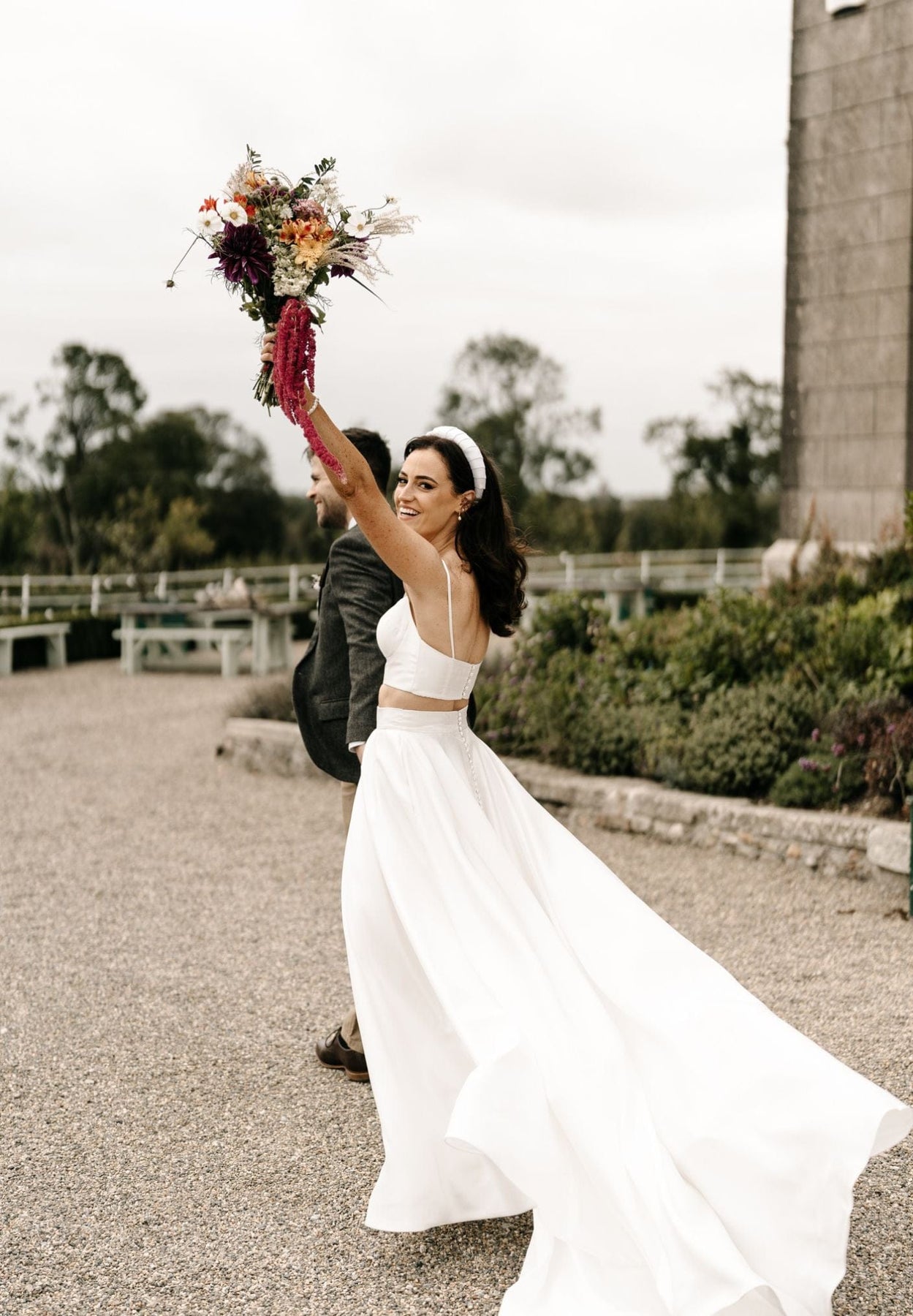 The voluminous Anna Skirt is cut from crips, oyster toned Thai Satin. The wide high waistband accentuates the small of the waist while the full circle cut of of the skirt drapes dramatically to the floor, ending in a sweeping train. Horse hair trim gives added structure to the hemline while delicate buttons close the center back from waist to hip level. The addition of inseam side pockets adds a modern touch to this traditional bridal silhouette.
