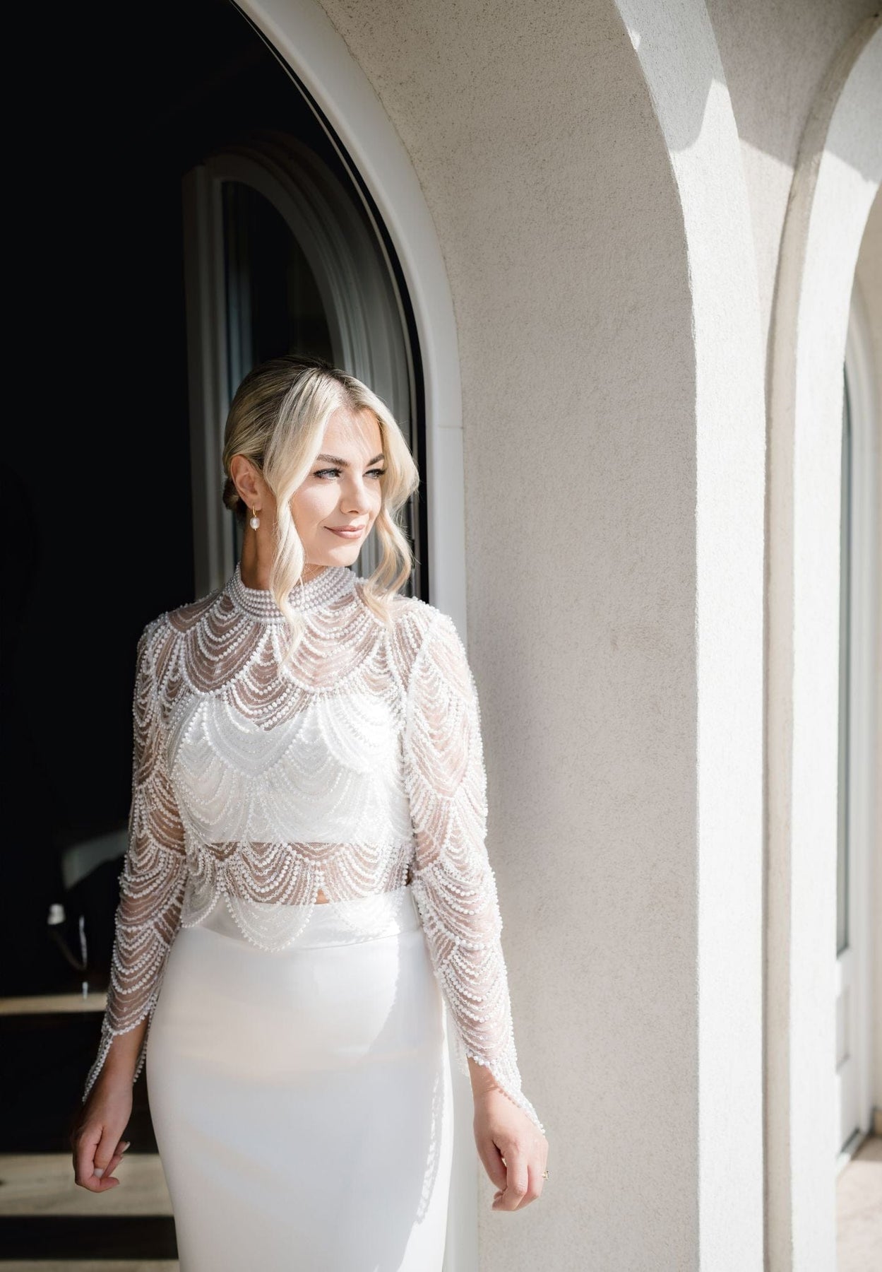 The Anya Topper is cut from a scalloped, faux pearl and sequin-adorned tulle, creating a dramatic scalloped hemline and curved wrist details. This sheer topper features semi-fitted long sleeves and a high collar that has been meticulously hand beaded in a process that takes more than 10 hours of work. The back of this decorative top closes with a row of faux pearl buttons. The Anya Topper is designed to be worn over your choice of bralette.
