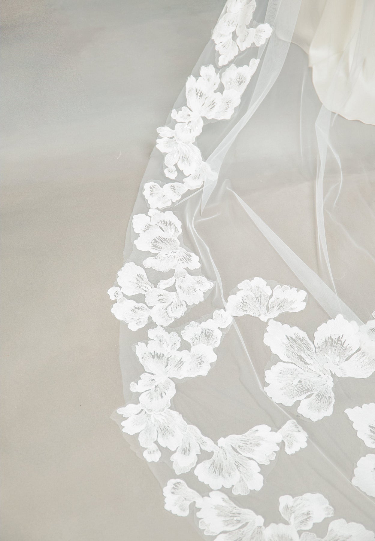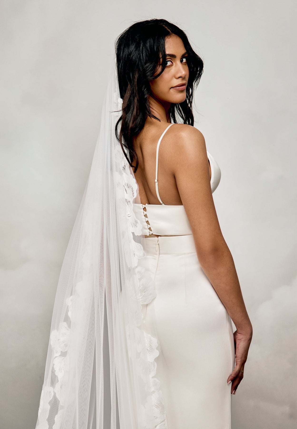The Daylily Veil's lace border perfectly matches the stunning Delaney Gown but will also add interest to a minimalist satin or crepe gown of your choice.
