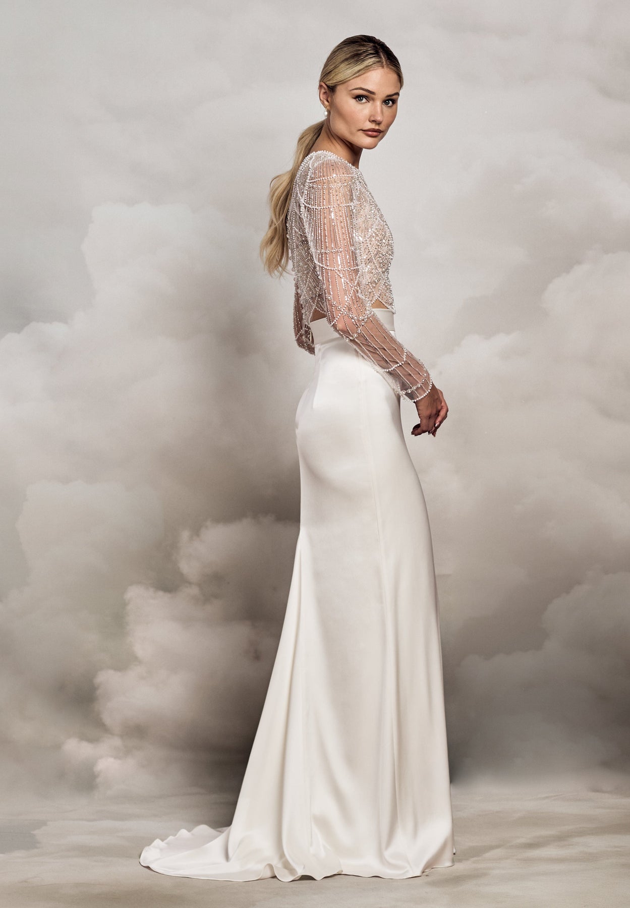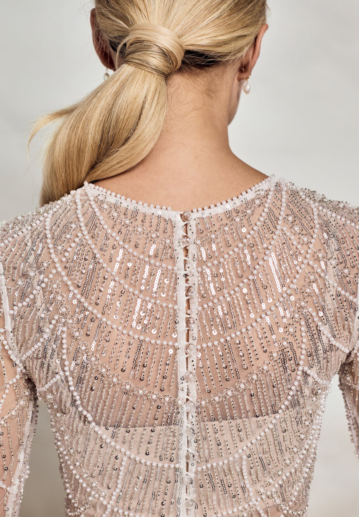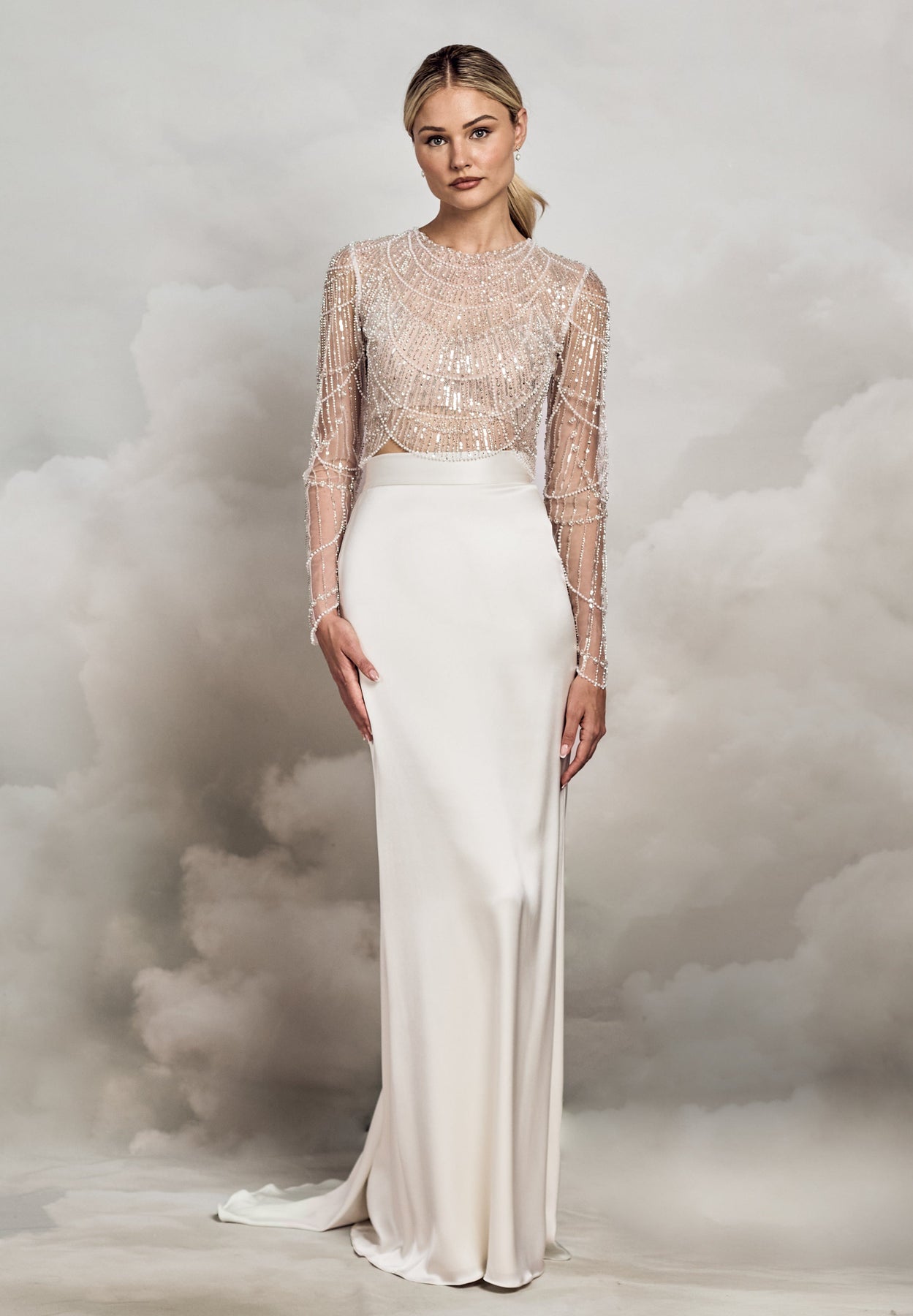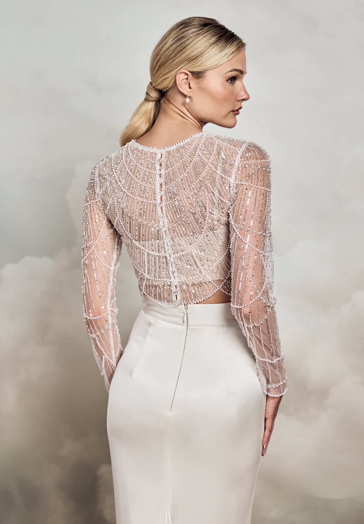 The vintage silver-toned and pearl accented Deacon Top is cut from scallop-beaded tulle with scatterings of iridescent sequin. The semi-fitted long sleeves finished with curved wrist details that sit elegantly over the hands. The round neckline offers a soft and flattering frame for the face, while the unlined main layer sits beautifully on the skin. Deacon's back opens with clear buttons and loops, designed to be layered over a bralette or bodice, and perfect for pairing with a dramatic bridal skirt or trousers.