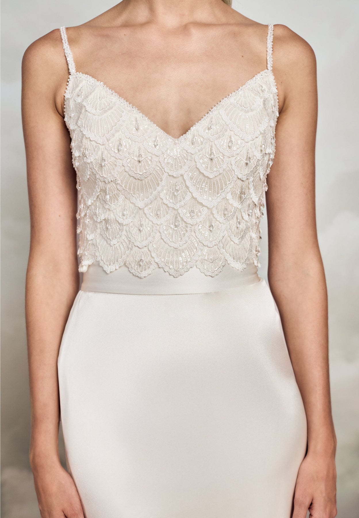 This elegant V-neck top is crafted from lightly fringed and embroidered scallop lace, adorned with thin, beaded straps for a refined touch. Clear crystal droplets embellish the scallop lace, adding subtle sparkle, while sequin details further enhance the intricate lacework. This bodice is lined with eco satin for a smooth, luxurious feel and features built-in bust cups and boning for added structure and support. The back opens with clear buttons and loops, ensuring a perfect fit while maintaining a seamless and elegant finish.