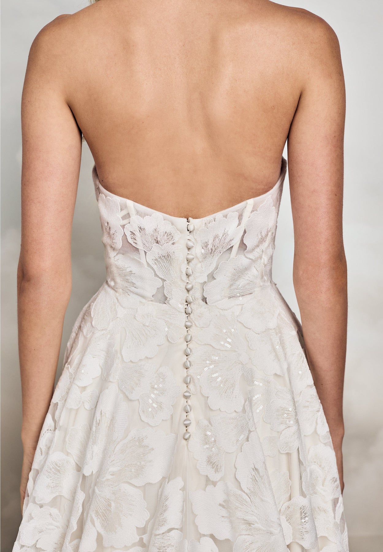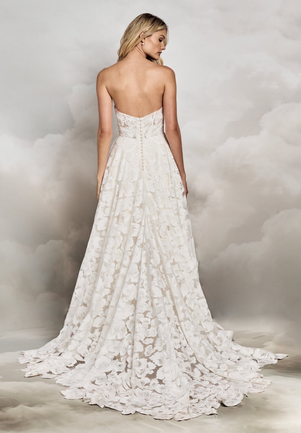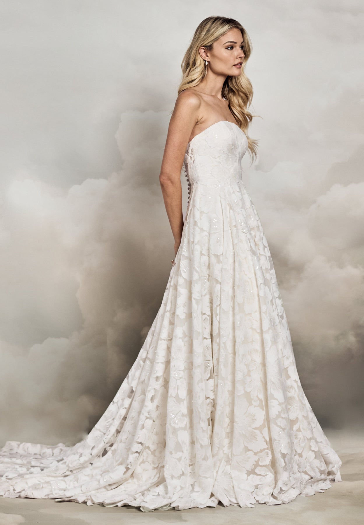 The Delaney Gown is cut from boldly embroidered and sequined floral lace. The straight, strapless neckline is supported by a structured eco satin lining, featuring bust cups and boning for added support. The back bodice is left unlined to showcase the lace and exposed boning on your skin. A voluminous full-circle skirt cascades into a breathtaking train, accented with an organic floral scalloped hemline that creates a show-stopping aisle moment. Concealed inseam pockets in the skirt add both practicality and interest. The gown is complete with a back zip hidden under decorative satin-covered buttons.
