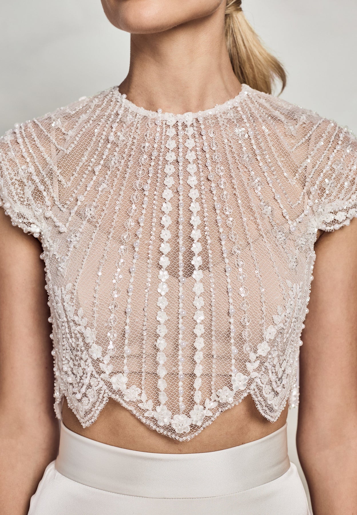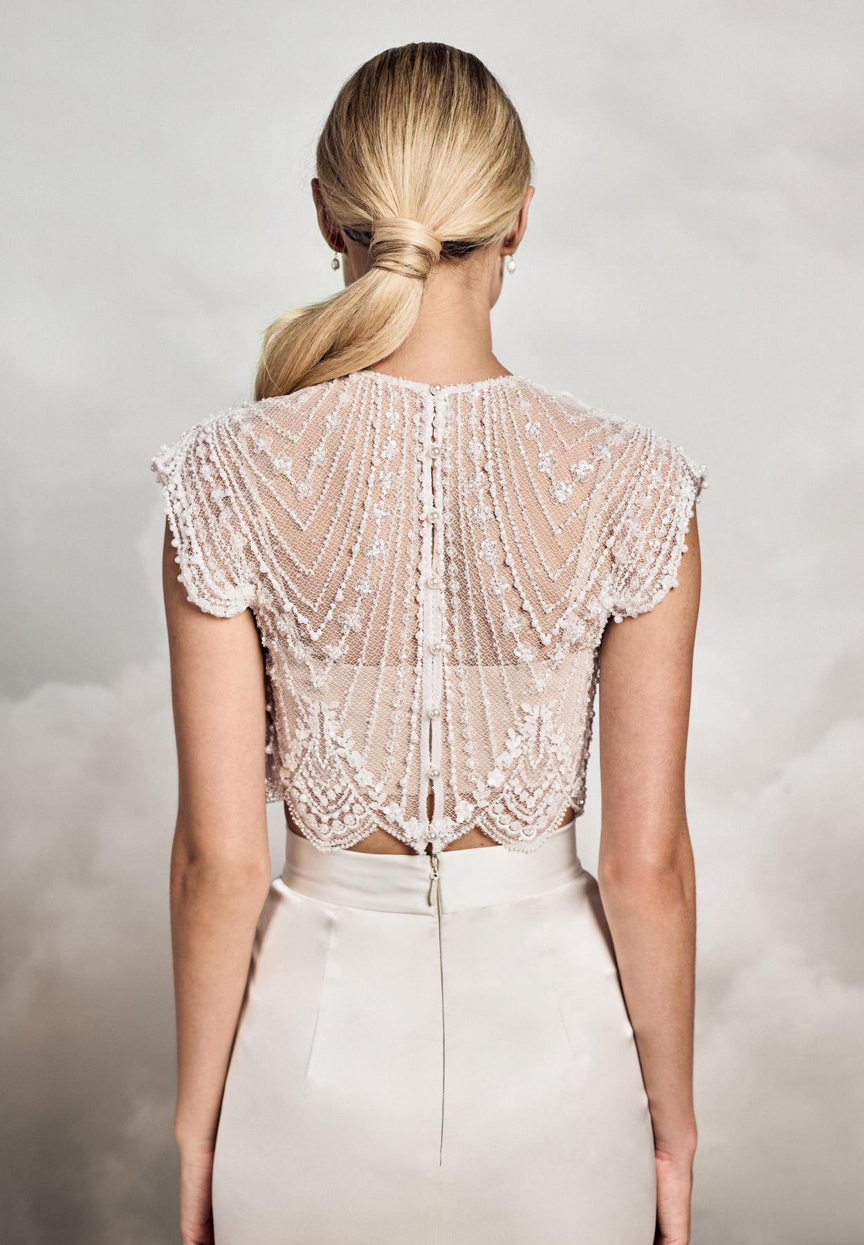 The Devyn Top is a vision of timeless elegance. Intricate floral lace adorned with delicate pearl and crystal beads adds a soft, romantic touch, while the scalloped hemline and grown-on cap sleeves create a feminine silhouette. Left unlined, the lace subtly reveals the skin beneath. The back opens with pearl buttons and loops. The Devyn top is designed to be worn over a bralette or bodice and is perfect for elevating a gown or pairing with a skirt.