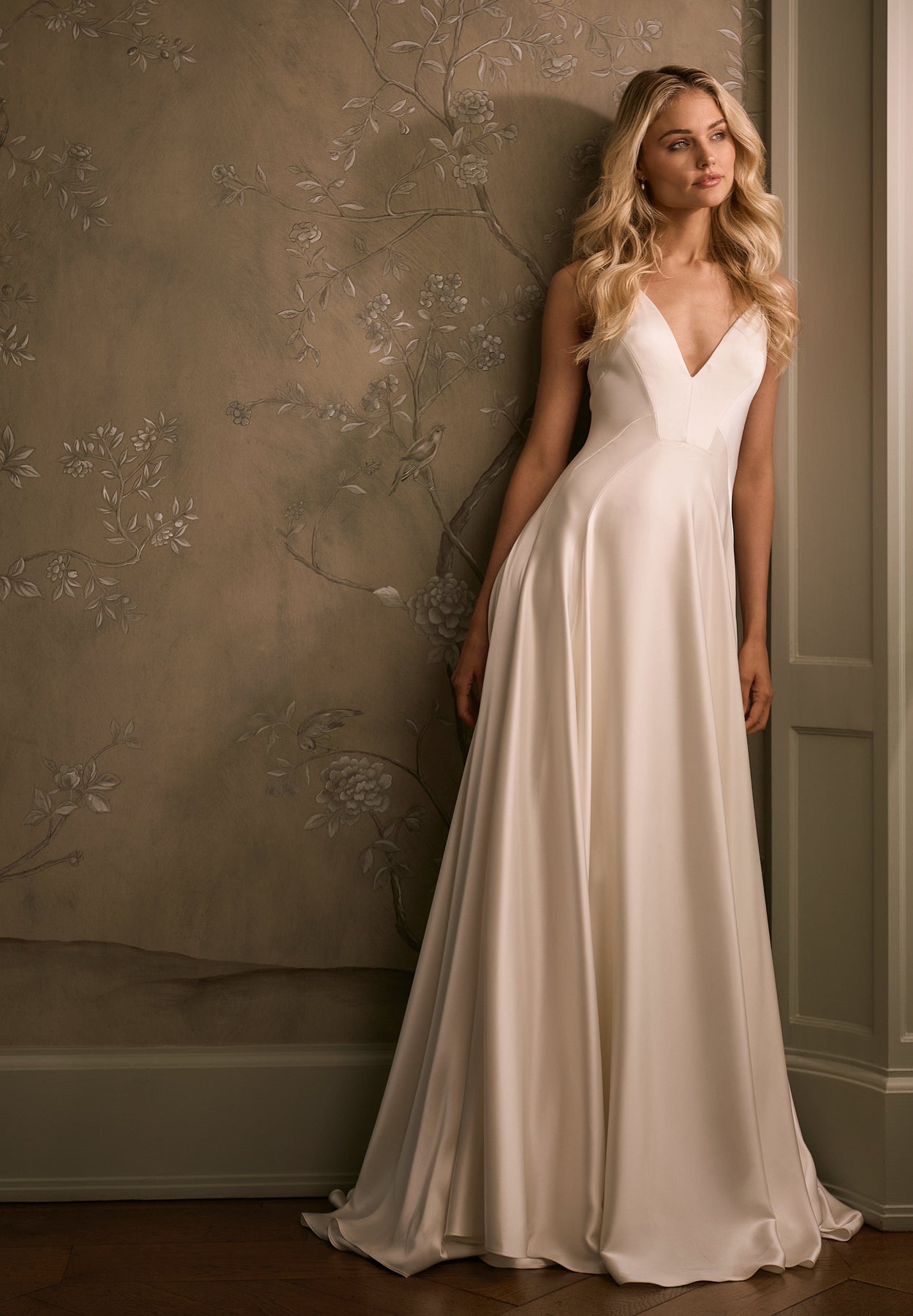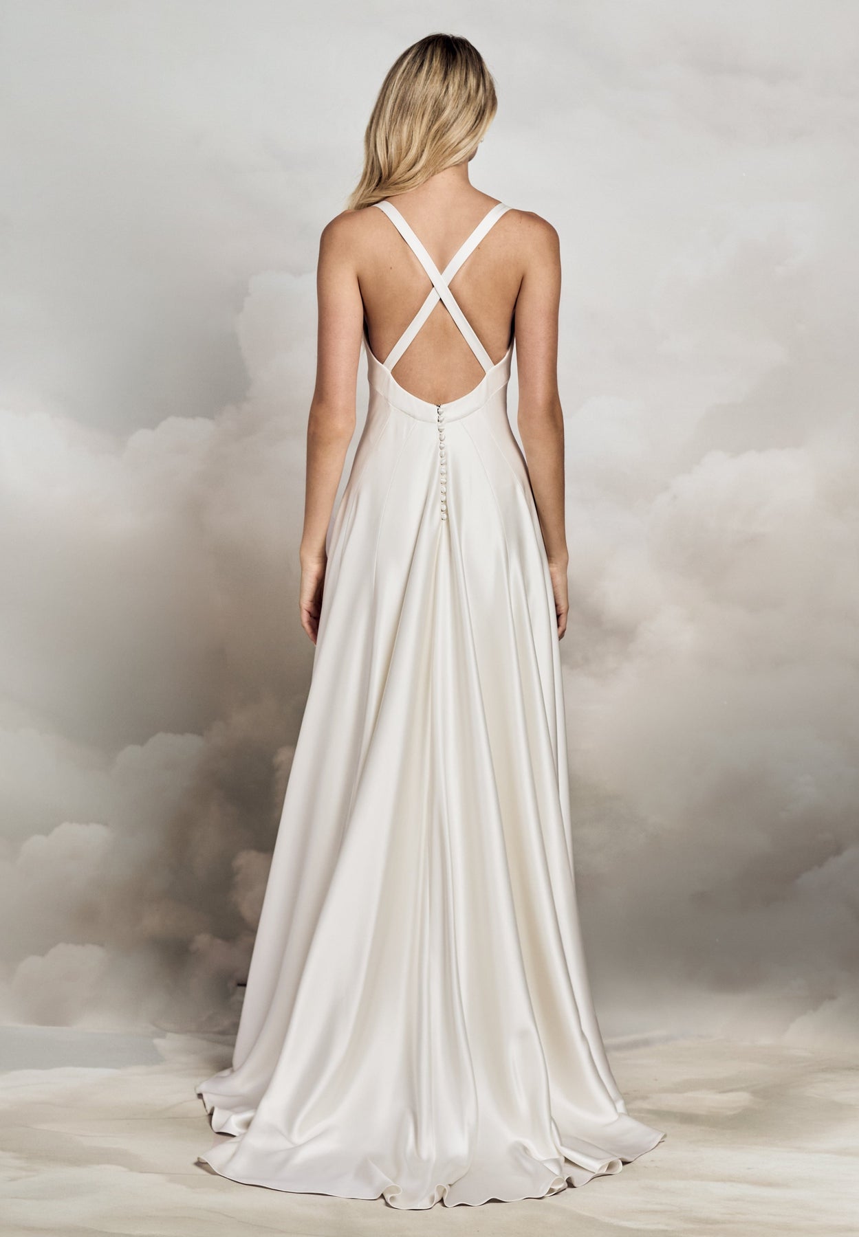 The heavy satin Dora Gown has been dubbed 'the ultimate second wedding dress' by our creative director, Catherine Deane herself, after wearing this piece at her wedding reception. Featuring a full A-line skirt with figure-flattering panels, this plunging V-neckline gown moves gracefully with every step you take. Thick straps cross over the open back, adding support along with concealed bust cups and boning throughout the rest of the bodice. The back opens with an invisible zip concealed under satin-covered buttons. Dora gown features a manageable train and is fully lined with eco satin lining.