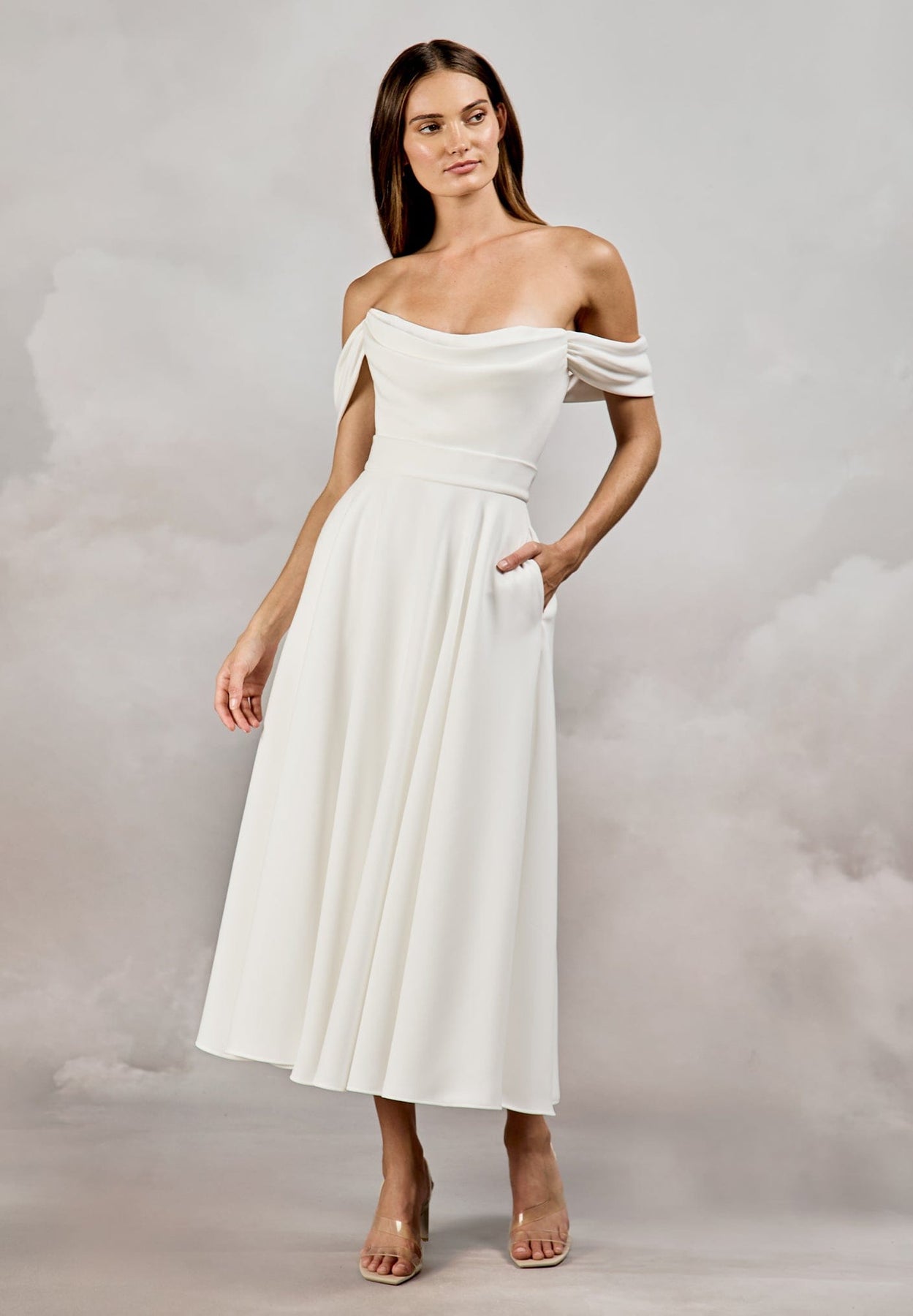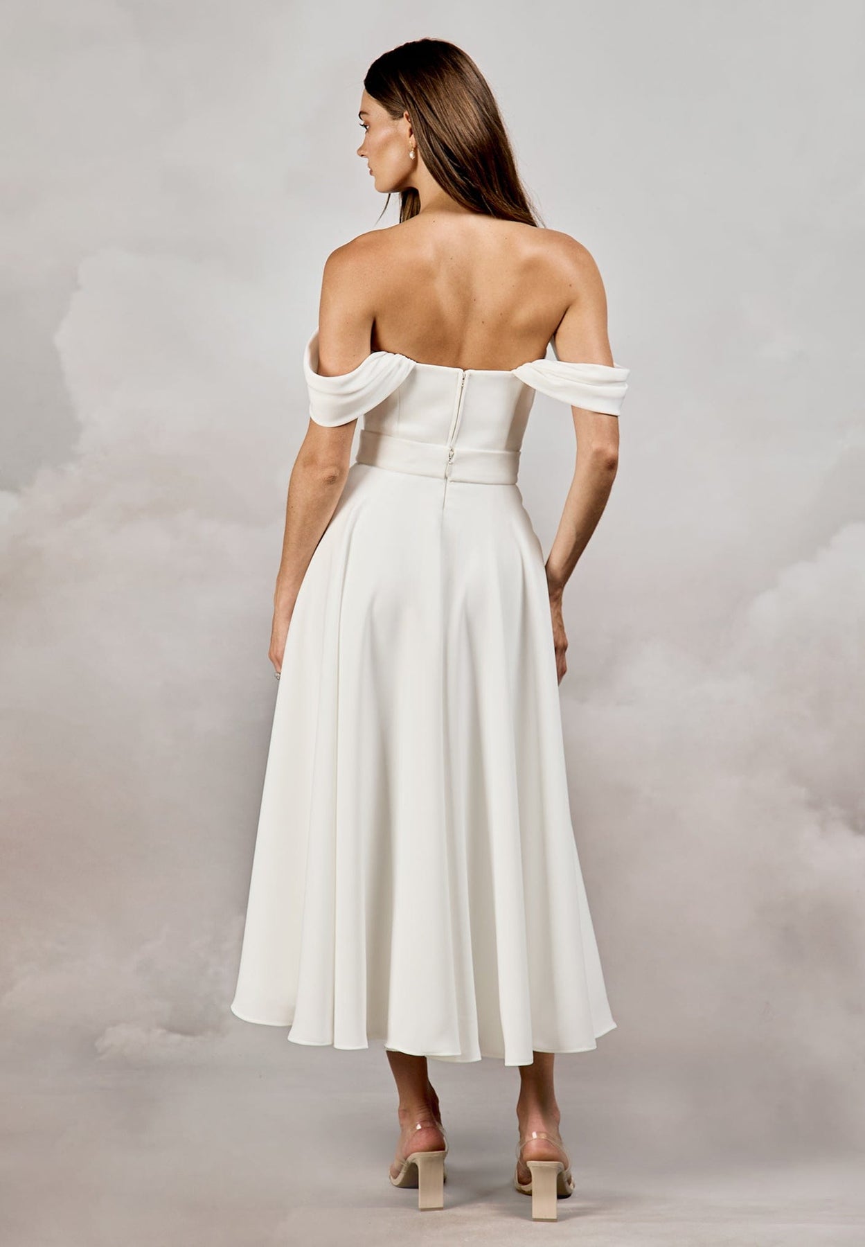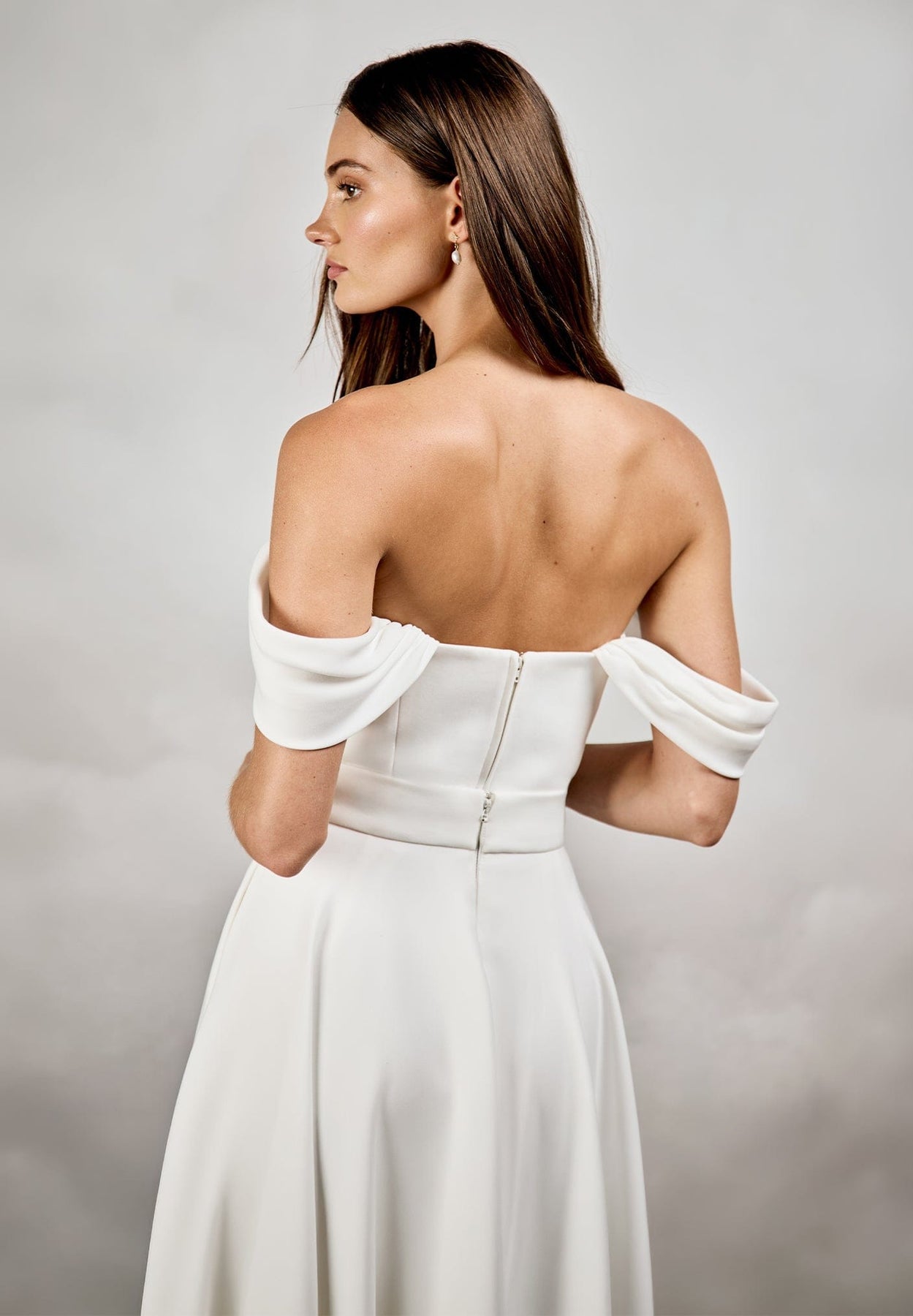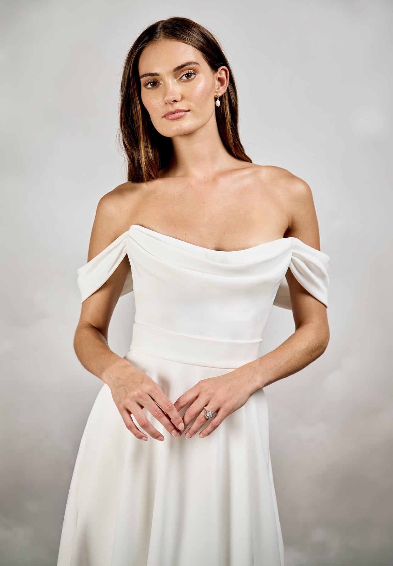 This cowl neck DuneTop in heavy crepe offers a luxurious, fluid drape while maintaining a beautifully structured, corseted fit, thanks to its built-in structure in the eco satin lining. Complete with detachable, off-the-shoulder sleeves, this modern bustier gives you flexibility of styling - whether you prefer a sleek, modern strapless look or the romantic flair of the draped sleeves. The centre back opens with a fully openable zip. Perfect for pairing with a flowing crepe skirt or trousers, this versatile bridal bodice combines timeless elegance with contemporary design.