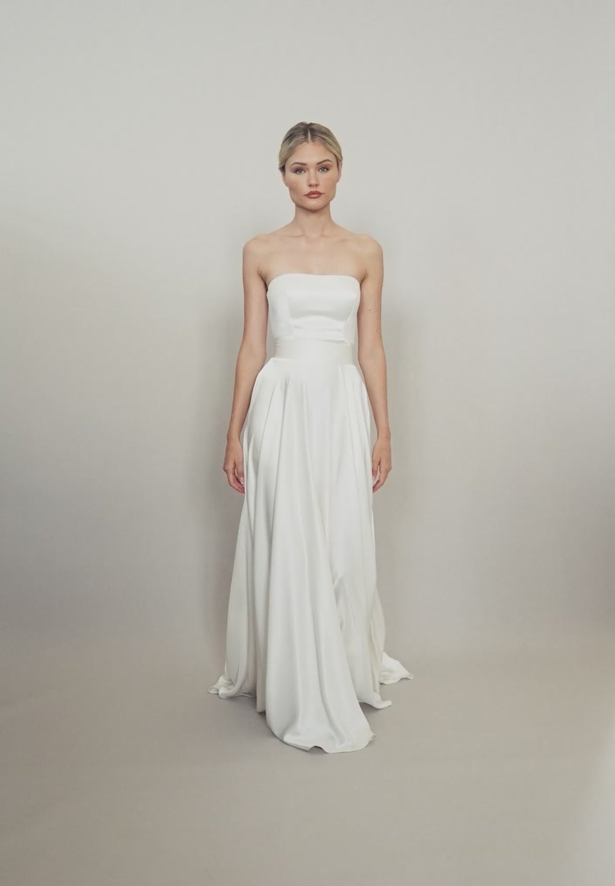 The versatile Eva Bandeau is cut from bridal ivory, heavy satin and features a straight and strapless neckline that pairs perfectly with an array of our bridal skirts and trousers. Eva's clean lines are kept to a minimum, with minimalist princess seamlines and a fully openable center back zip. Built-in bust cups and boning add structure to this sleek silhouette.