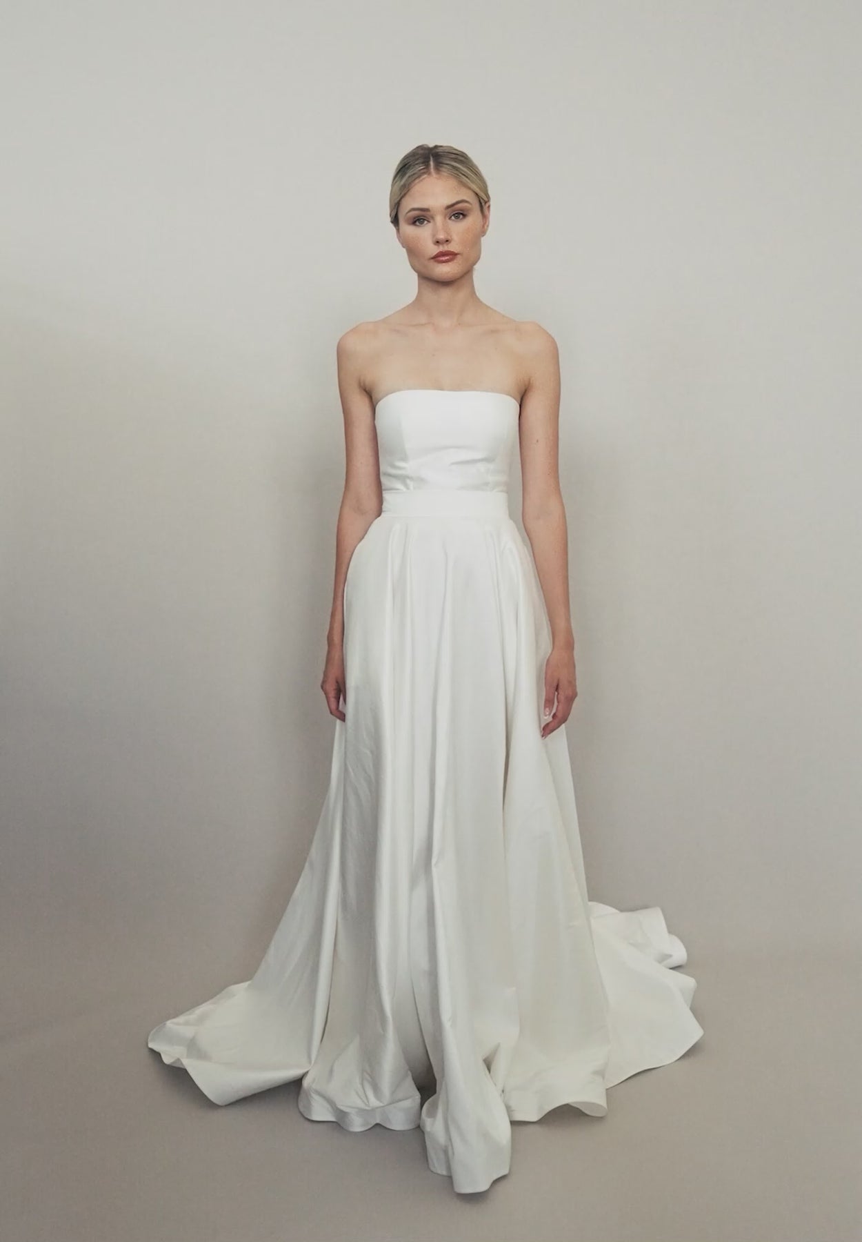 The Eva Bandeau in 100% silk Dupion is modern, effortless, and versatile. This minimalist straight neckline bodice is perfect for styling with an array of our bridal skirts and trousers. The Eva Bandeau is boned throughout for a comfortable fit and sewn-in bust cups provide support for its strapless foundation. The center back of this bodice opens with a fully openable zip.