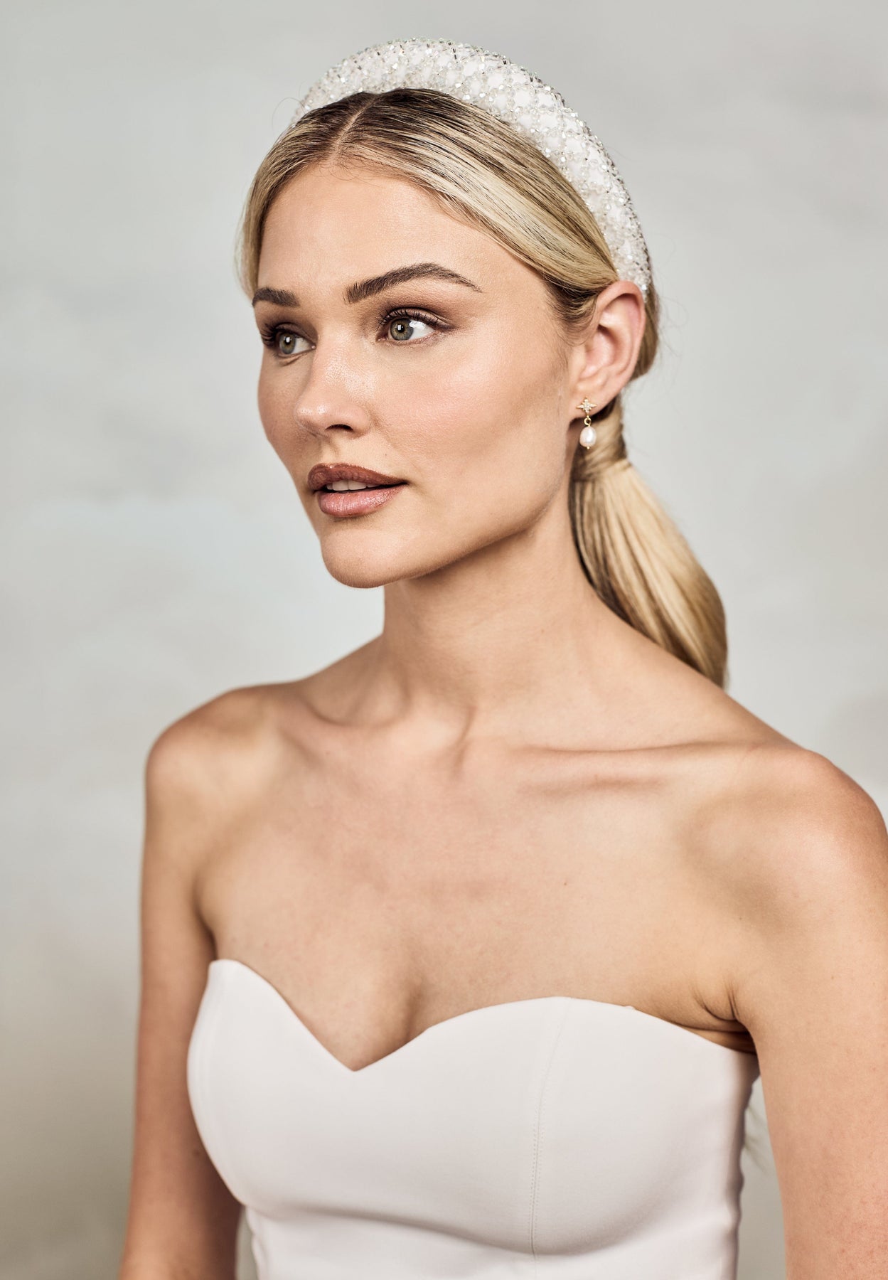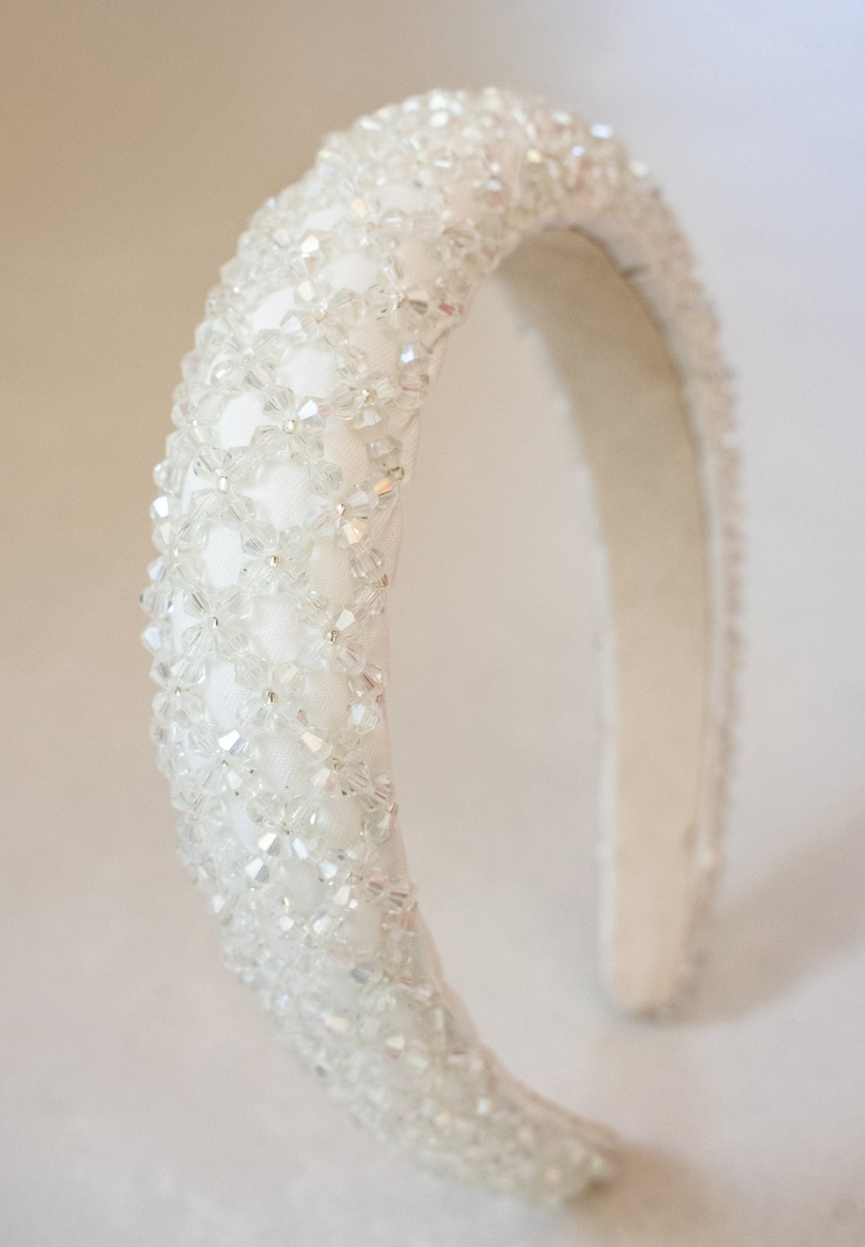 The statement Julliet Headband is a bold and elegant bridal accessory, covered in satin for a luxurious finish. The intricate glass beaded trellis pattern adds a touch of glamour and texture, catching the light with every movement. Ideal for elevating your bridal look, this headband is the perfect keepsake to remind you of your special day.
