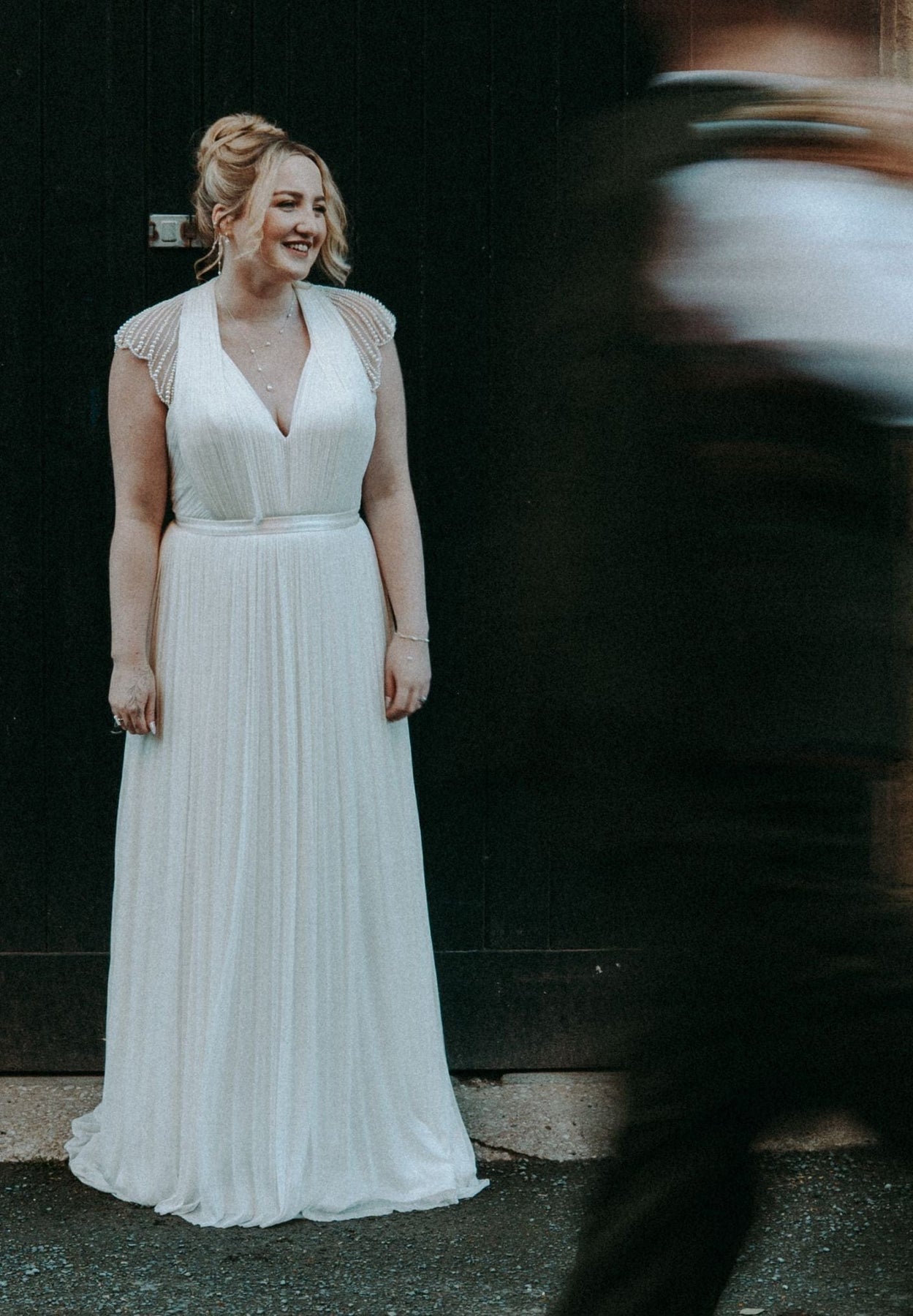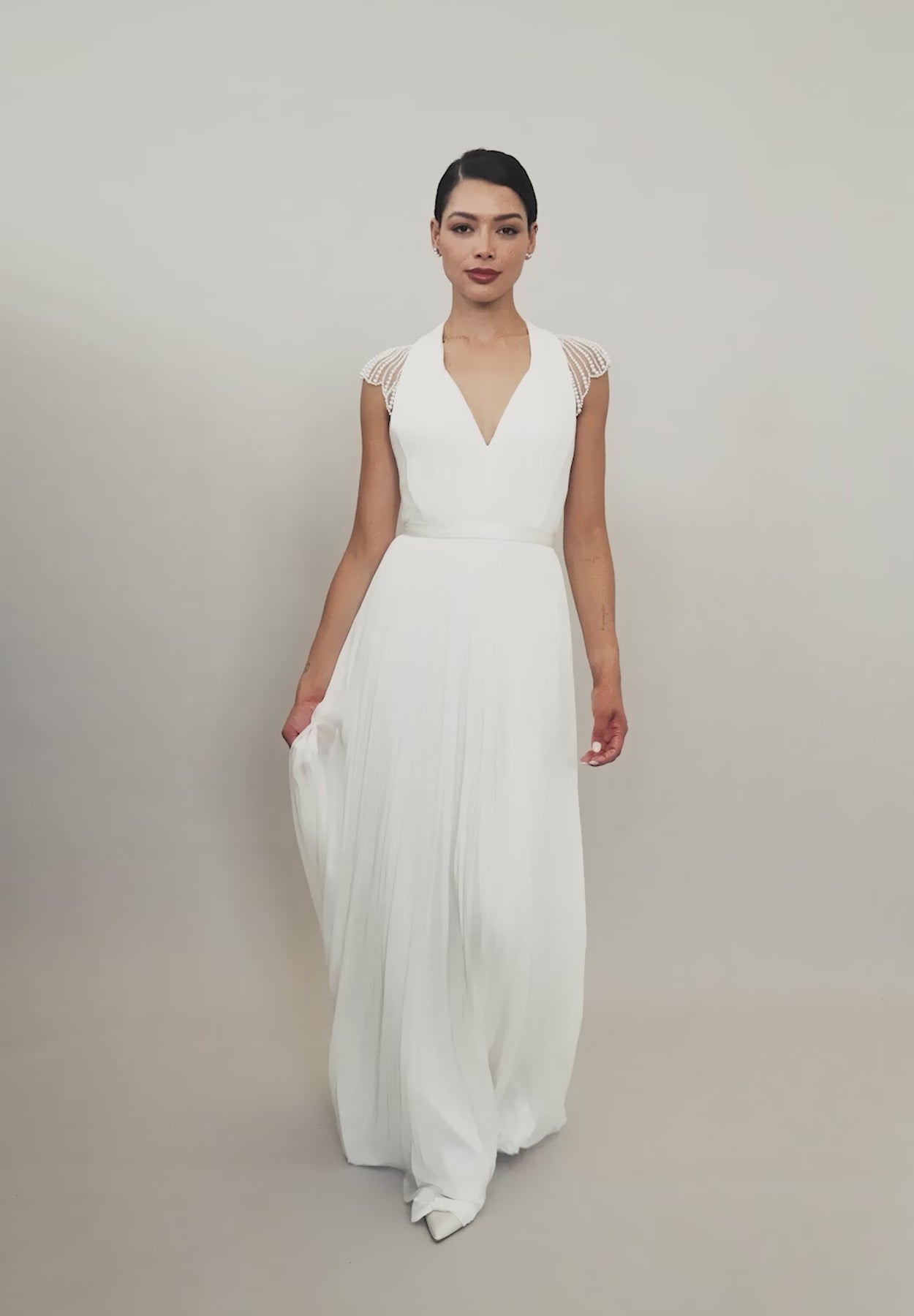 The full-length Kellyn Gown is draped in softly gathered, oyster coloured silk tulle, featuring a demure plunging V-neckline that wraps around the back of the neck in a halter design. One of the most striking features of this wedding dress is the sheer tulle back and sleeves that come down from under the halter style lines The back and sleeves are adorned with over 30 hours of meticulously hand beaded pearls in a radial design. Subtle scallops finish the edges of the sleeves. Built-in bust cups and boning, concealed within the front bodice ensure a comfortable fit with a relaxed fitting skirt that ends in a sweeping train.