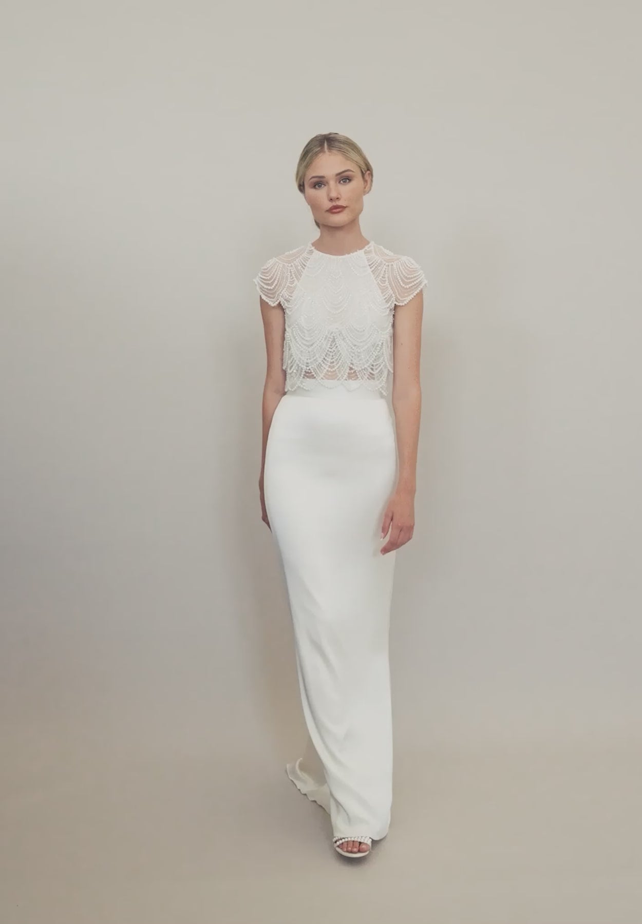 The Monique Top features tiered layers of pearl-beaded scalloped tulle, creating plenty of movement in this loose-fitting design. The raglan cut lining adds coverage to the front and back of the bodice, while the decorative scalloped short sleeves are left unlined to reveal hints of skin. The round neckline closes at the back with a silk-covered button above a keyhole. The Monique Top is a perfect match for an array of our silk tulle and heavy satin trousers and skirt options.