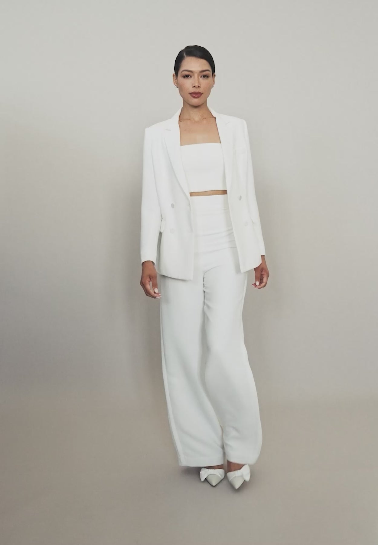 Classically cut from a bone white crepe, the Peyton Blazer is an essential for the modern woman. With her double-breasted detail and subtle shoulder pads, this tailored piece is a classic to be treasured for years to come. The Peyton Blazer is perfect for our modern brides looking or a less traditional bridal look or for your civil ceremony.