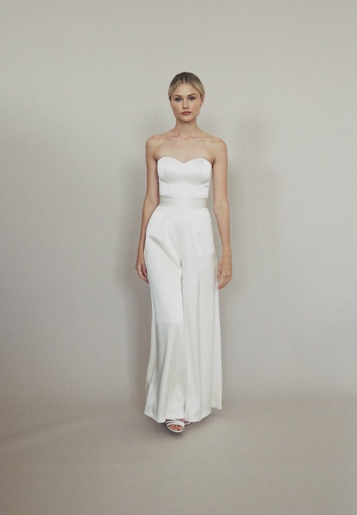 The Ryo Jumpsuit is cut from bridal ivory heavy satin and features a subtle sweetheart neckline that drapes dramatically into a wide-leg trouser. Princess seams conceal internal bust cups and boning to ensure a snug bodice fit, while the thick, attached waistband seams cinch in the small of the waist. The pants of this modern piece are adorned with box pleated details and pockets to create a flattering fit. Style his modern bridal jumpsuit as-is or with an array of our tops, jackets, and capes to create your own unique bridal look.