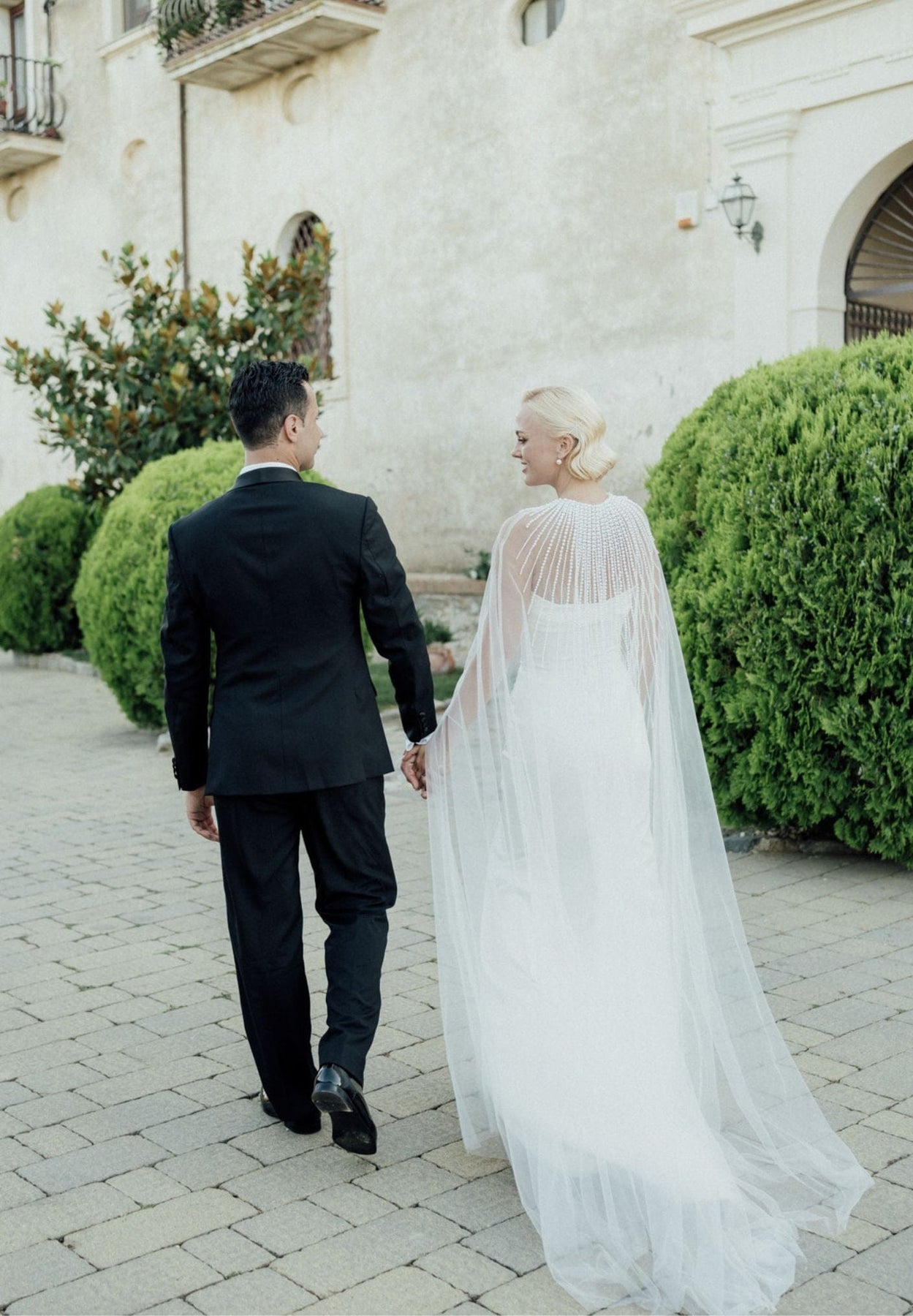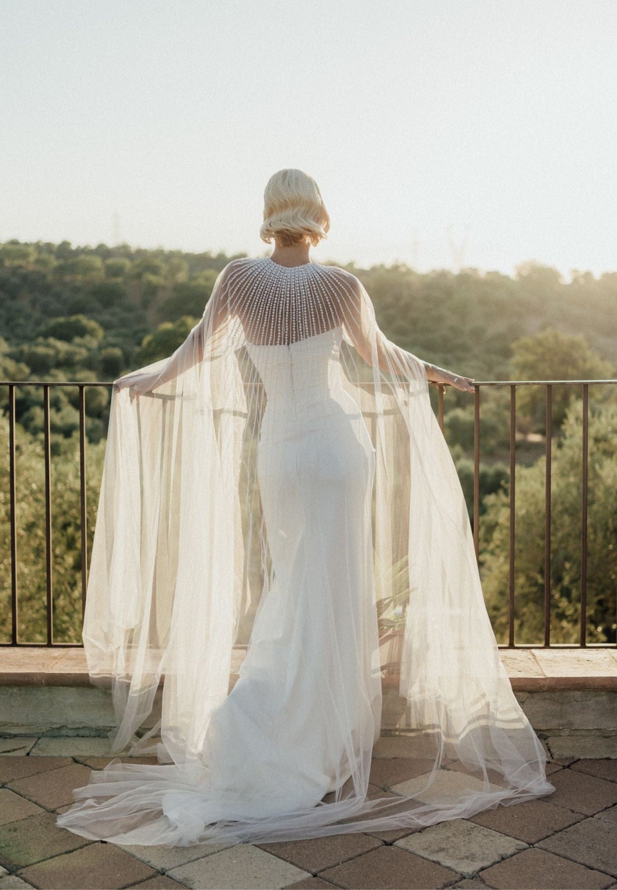 The whimsical Stardust Cape is cut from oyster-toned illusion tulle and entirely hand beaded with pearl sprays in a process that takes up to 20 hours of work. The round neck for this cape closes with a faux pearl button while the sheer illusion tulle drops dramatically to the floor. The Stardust Cape makes a statement when worn over a satin slip dress or bridal set.